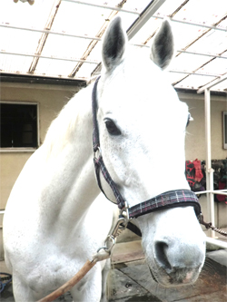 全身真っ白でとてもきれいな芦毛です。性格も温厚で、乗っても素直で軽く、とてもよく動いてくれます。女性陣の人気の的になっています。